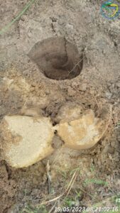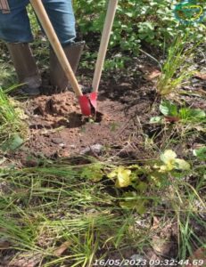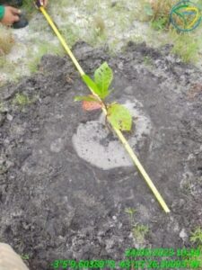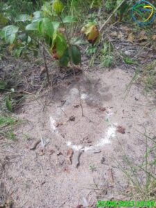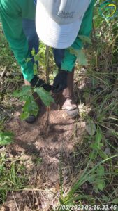 Com base no espaçamento definido no planejamento, realizamos a atividade de marcação das covas. No local foram realizadas uma limpeza e a demarcação do local de perfuração delas.