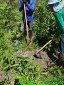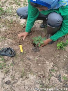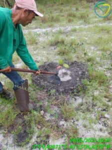Após a marcação, foi realizado abertura das covas de plantio. Devido as características do solo, solo arenoso, essa atividade foi realizada com o método manual. Para isso, foi utilizado cavadeiras.