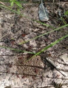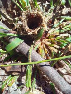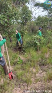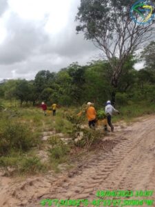 Foi realizado o coroamento manual das mudas plantadas de toda vegetação existente em um raio de 80 cm ao redor da muda, para evitar a competição por água, luz e nutrientes com a vegetação herbácea e trepadeiras.