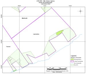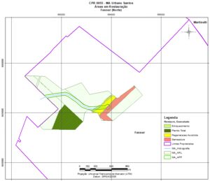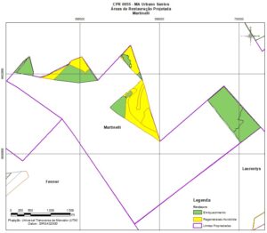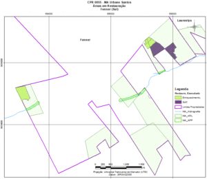 O trabalho foi realizado por faixas, margeando a reserva legal, para detalhar as nascentes e córregos da área do projeto, assim como o uso do solo no entorno das áreas a recuperar.