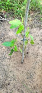 Quando a planta atingir de 35 cm a 40 cm deverá ser amarrada ao piquete, para que o seu desenvolvimento se torne ereto, permitindo melhor formação da copa. O piquete poderá ser o mesmo utilizado na marcação da área para a abertura das covas. Dessa forma, todas as mudas que apresentavam essas características de altura, foram tutoradas.