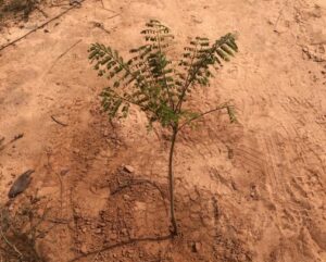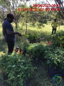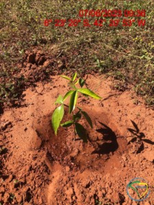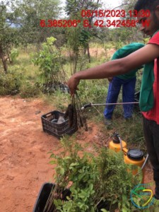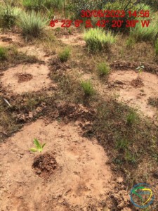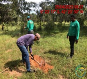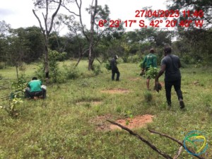 As atividades de plantio tiveram início no dia 27/04/2023 e foram concluídas na data de 28/05/2023. Foram plantadas, inicialmente, um total de 31.312 mudas de essências nativas da região, pertencentes ao Bioma Cerrado, na fazenda Chapada Grande. As 31.312 mudas plantadas estão distribuídas em 12 famílias botânicas, 25 gêneros botânicos e 31 espécies. O plantio das mudas foi realizado dentro da área isolada de 108,58 hectares por cercamento, com densidade de plantio de aproximadamente 999 mudas/ha, sendo 31.312 mudas em 31,35 hectares utilizando a metodologia de plantio total.