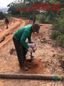 A marcação/abertura das covas de plantio é uma atividade que antecede ao plantio das mudas, podendo ser realizada manualmente com uma enxada e mecanicamente com um perfurador de solo. No caso, foi utilizado ambos os métodos visando uma maior produtividade, sendo um operador no perfurador de solo e dois colaboradores com as enxadas.