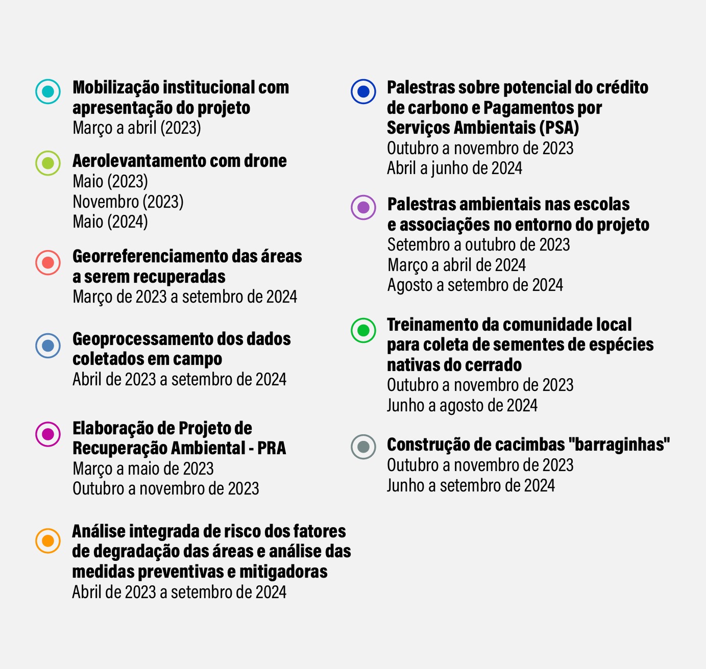 O projeto tem como finalidade a restauração de áreas degradadas no bioma Cerrado, priorizando as áreas de reservas legais e áreas de preservação permanente, com foco na restauração florestal e recuperação dos recursos hídricos.