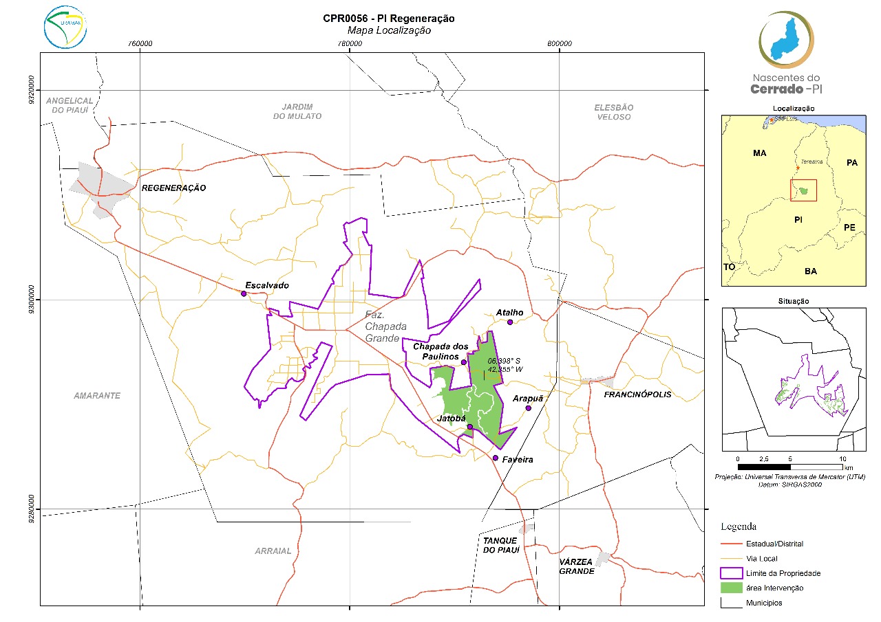 As intervenções de recuperação ambiental serão em 3.080 ha de Área de Reserva Legal (ARL) e 547 ha em Áreas de Preservação Permanente (APP) na propriedade Chapada Grande, no município de Regeneração/PI.