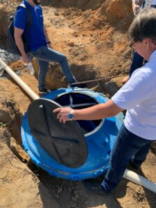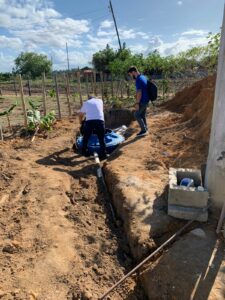 Dessa forma foi estimada a média de distância de 15 metros para dimensionamento da tubulação a ser instalada em cada unidade de tratamento de esgoto unifamiliar. Para instalação das unidades foi contratada empresa com máquina escavadeira para agilizar o processo de construção da vala necessária para a Unidade de Tratamento de Esgoto Unifamiliar e equipe para instalação da tubulação e adequações necessárias. Todo processo de instalação foi monitorado pela equipe do IBRAMAR.