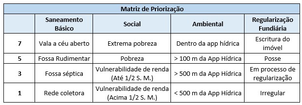 Foram selecionadas 50 famílias de produtores rurais da zona rural do município de Linhares no distrito de Farias. Inicialmente foram selecionados produtores em conjunto com a secretaria municipal de assistência social, utilizando critérios objetivos de vulnerabilidade social, impacto ambiental na app hídrica, saneamento básico e regularização fundiária conforme matriz de priorização abaixo: