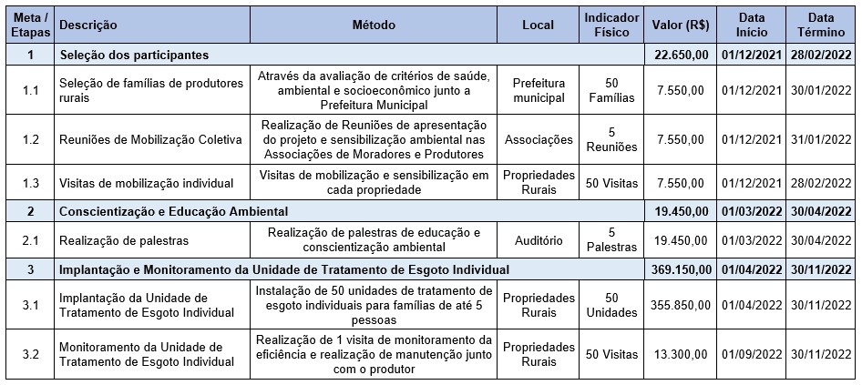 O projeto foi realizado com a instalação da unidade de Tratamento de Esgoto individual. Foi realizada orientação técnica e acompanhamento na implantação das unidades de tratamento.